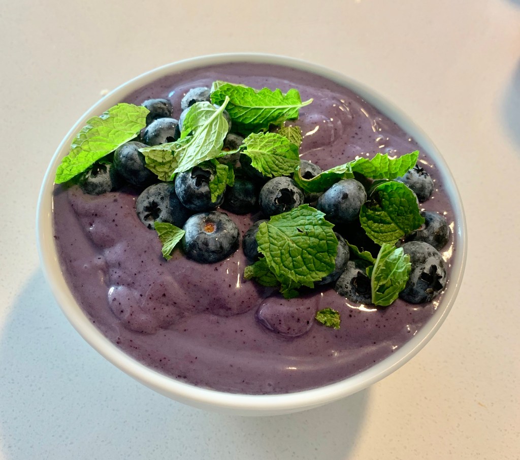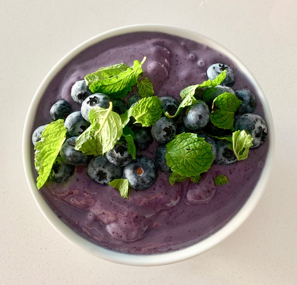 Blend the blendables and top with toppings. This recipe combines the dark sweetness of blueberry with the refreshing pop of mint. A classic for a warm summer Saturday.