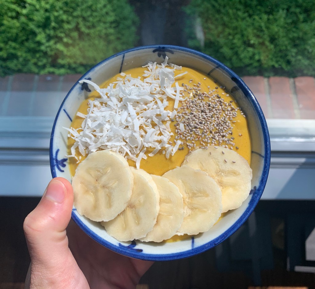 This recipe is modified from BourbonAndHoney‘s Coconut Mango Turmeric Smoothie.